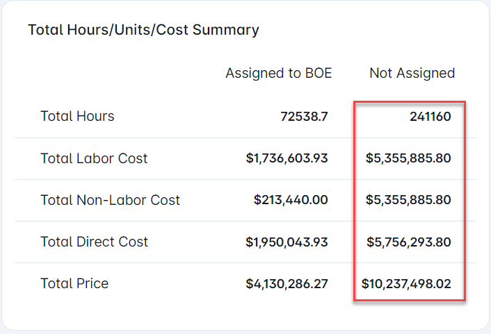 Enable users to click any unassigned value in the Total Hours/Units/Cost summary widget on the BOE List and automatically open the Estimates List pre-filtered to show only unassigned estimates. This provides a fast, contextual way to review and assign outstanding estimate items.