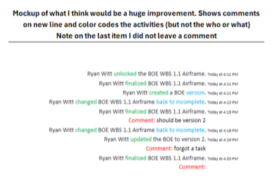 The current activity feed is difficult to scan and requires users to read every single word to understand what the activity was. All entries look similar, lack visual hierarchy, and do not clearly highlight the action taken or the impacted record. This makes it slow and cognitively demanding to review changes, especially when there are many updates or when users are trying to quickly understand recent activity.